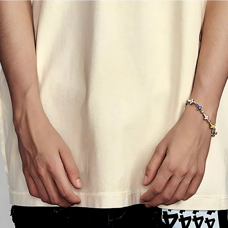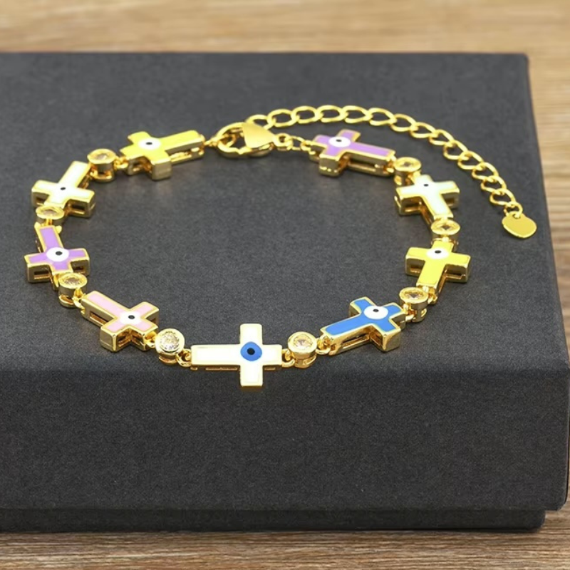 Premium 18k gold plating meets nine perfectly enameled crosses and high-quality crystal accents.