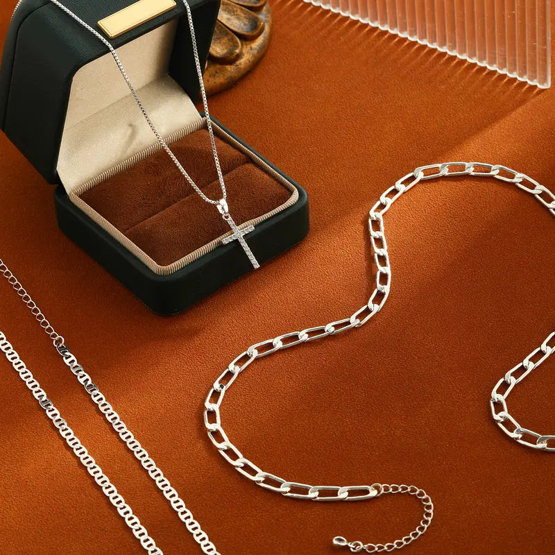 The sleek cross pendant, smooth paperclip chain, and textured choker work together or separately to match any outfit.