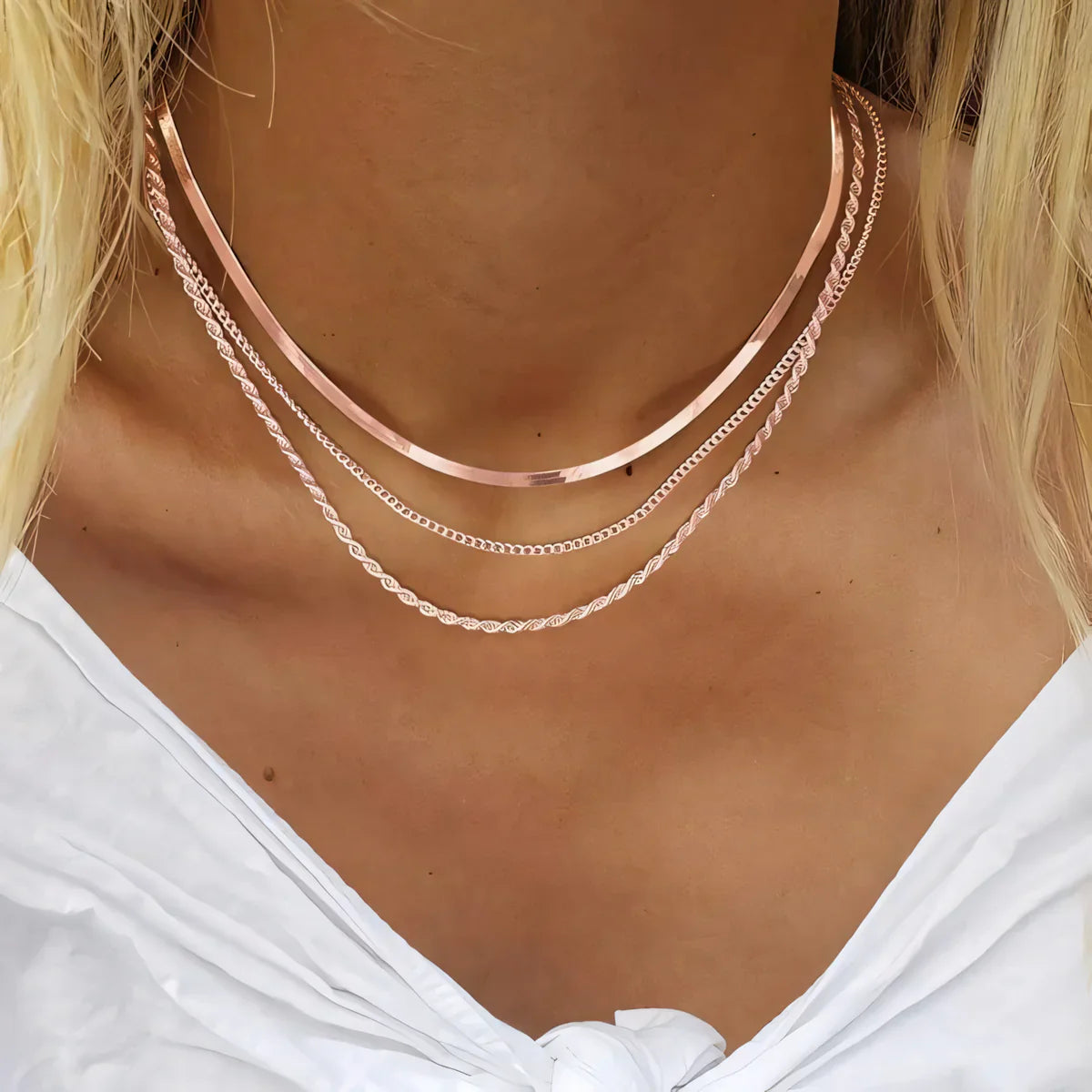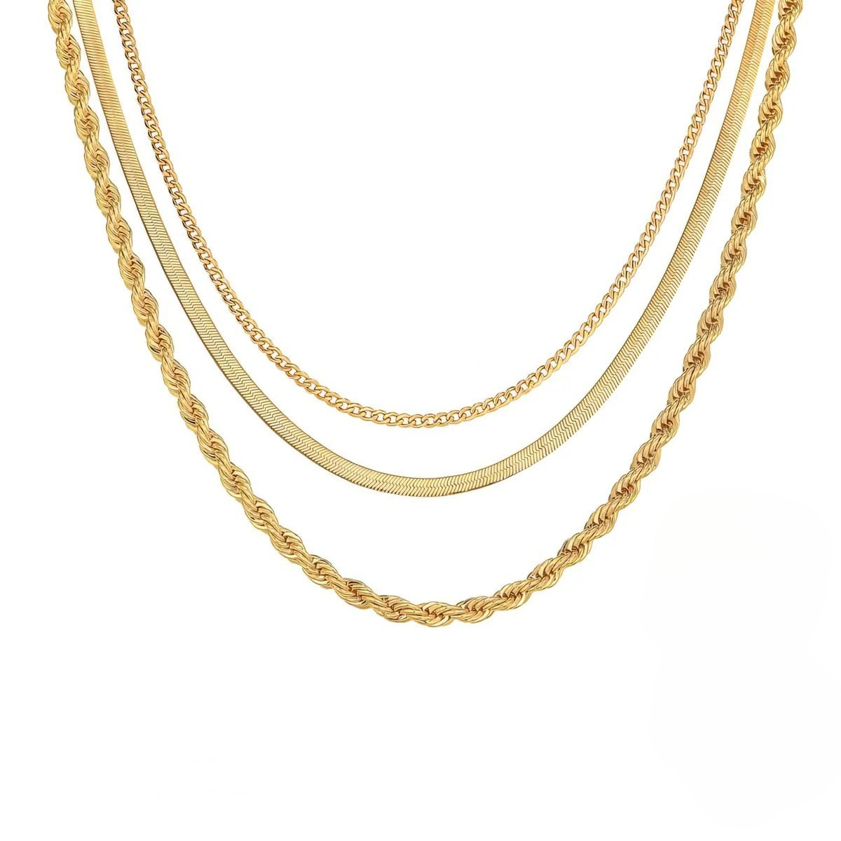 Each chain - the smooth herringbone, classic curb, and textured rope - works beautifully alone or together to create that coveted layered style that looks expensive and intentional.
