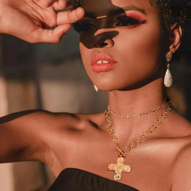 This striking cross chain necklace features chunky gold links that create instant drama while the textured cross pendant adds that perfect touch of meaning to your look.