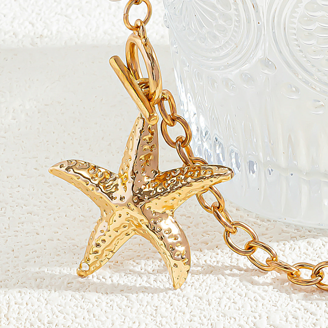 Delicate seashells are carefully paired with a radiant gold starfish pendant for balanced, eye-catching design.