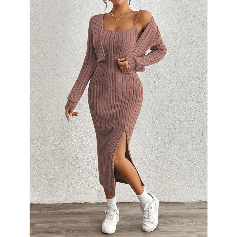 Dieses Strickkleid-Set bringt Stil und Vielseitigkeit in deine Garderobe. Ob für den Alltag oder besondere Anlässe – es unterstreicht deine Figur und sorgt für einen selbstbewussten Auftritt.