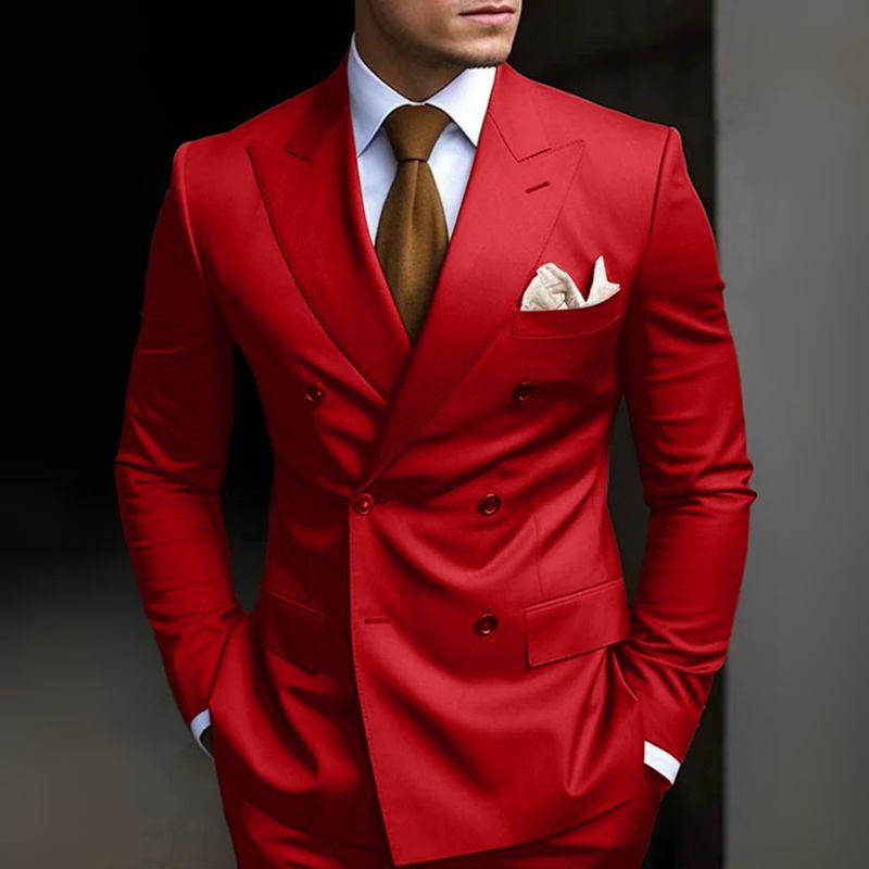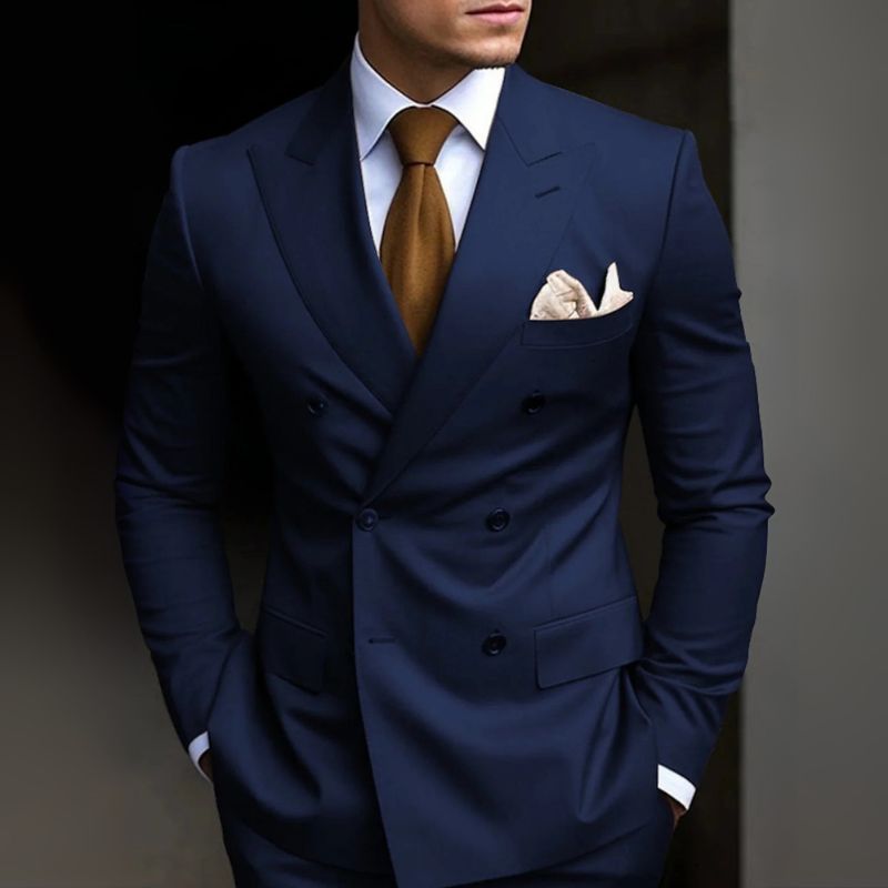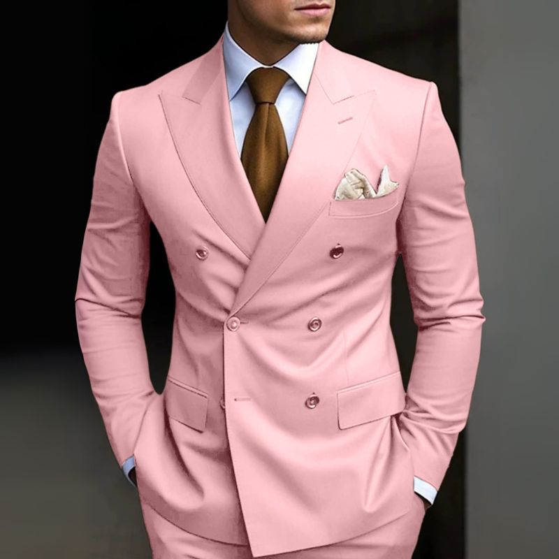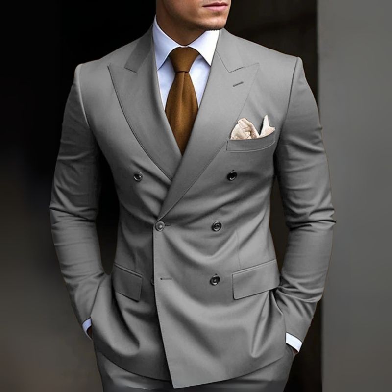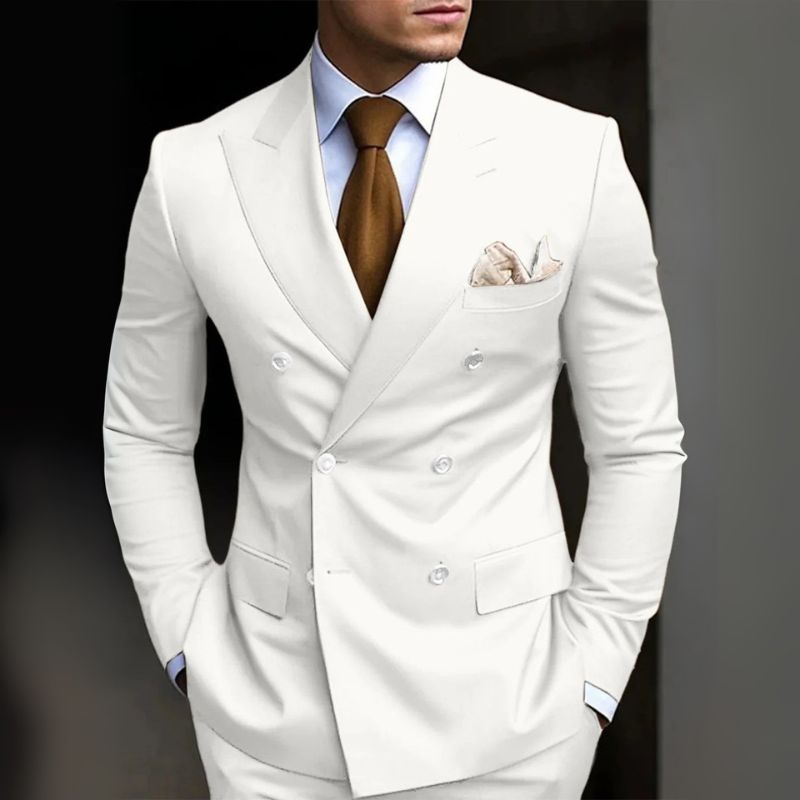 Ein Hochzeitsanzug mit klarer Linie und starker Silhouette. Doppelte Knopfreihe und moderne Details unterstreichen den Auftritt.
