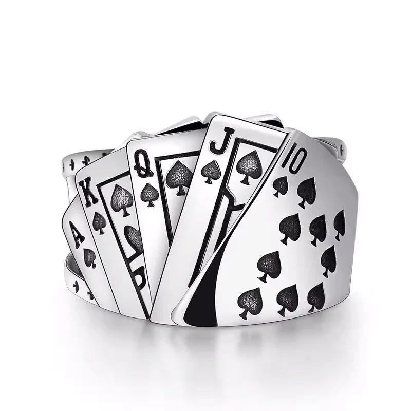 Five engraved cards form the legendary royal flush across your finger with red crystals bringing each suit to life.