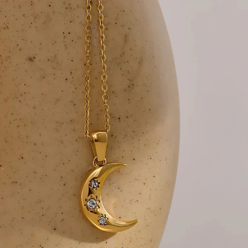 This stunning crescent moon necklace features three brilliant stones that catch light like stars in the night sky.