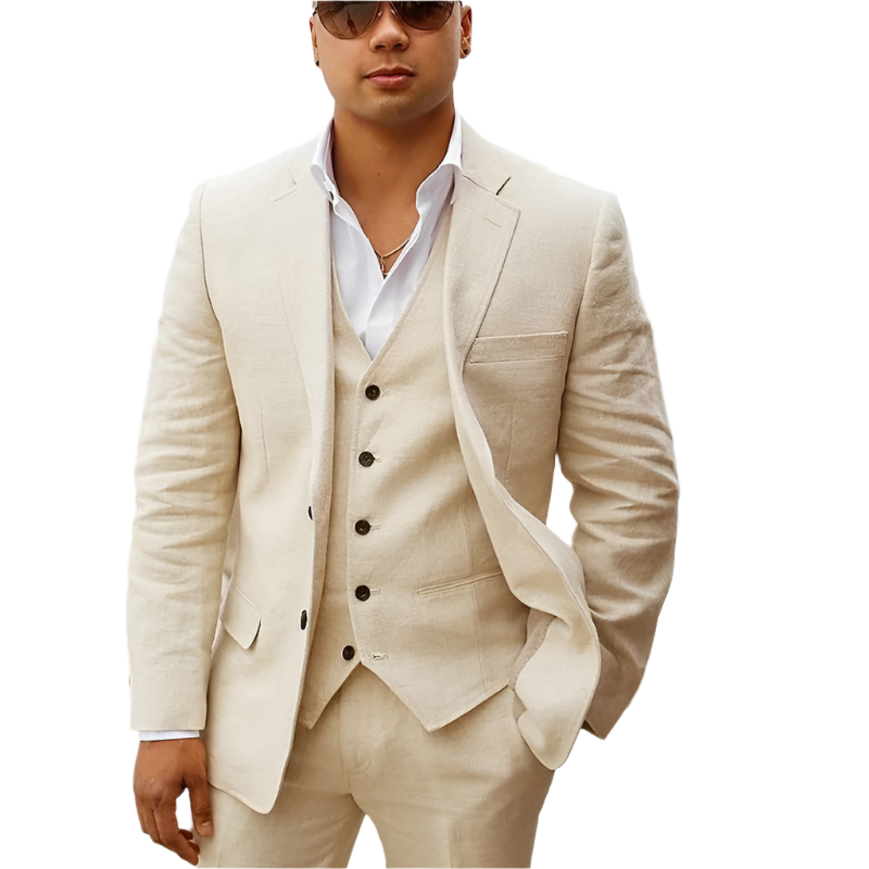Dieser Herrenanzug kombiniert eine lockere Schnittführung mit klarer Struktur. Ideal für Hochzeiten, Feiern am Strand oder sommerliche Events ein Ensemble, das Stil und Leichtigkeit vereint.