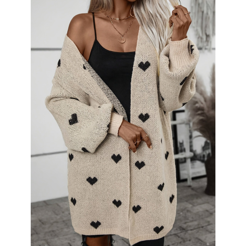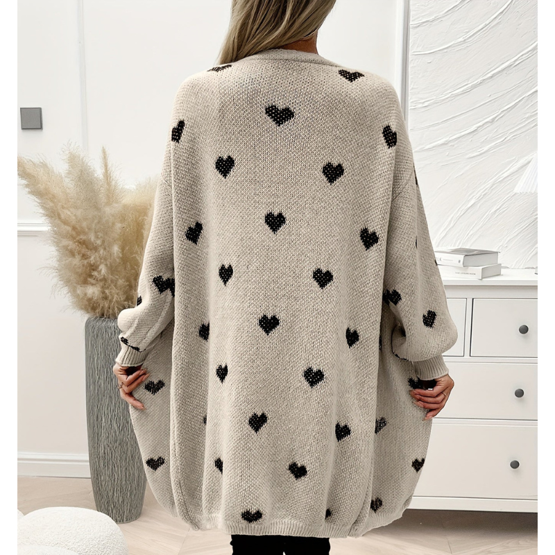 Dieser Cardigan bringt mit seinem verspielten Herzmuster Abwechslung in deine Garderobe. Das lange Design macht ihn ideal für verschiedene Anlässe – ob zu Hause, beim Stadtbummel oder im Büro. Ein stilvoller Begleiter, der jedem Outfit eine besondere Note verleiht.