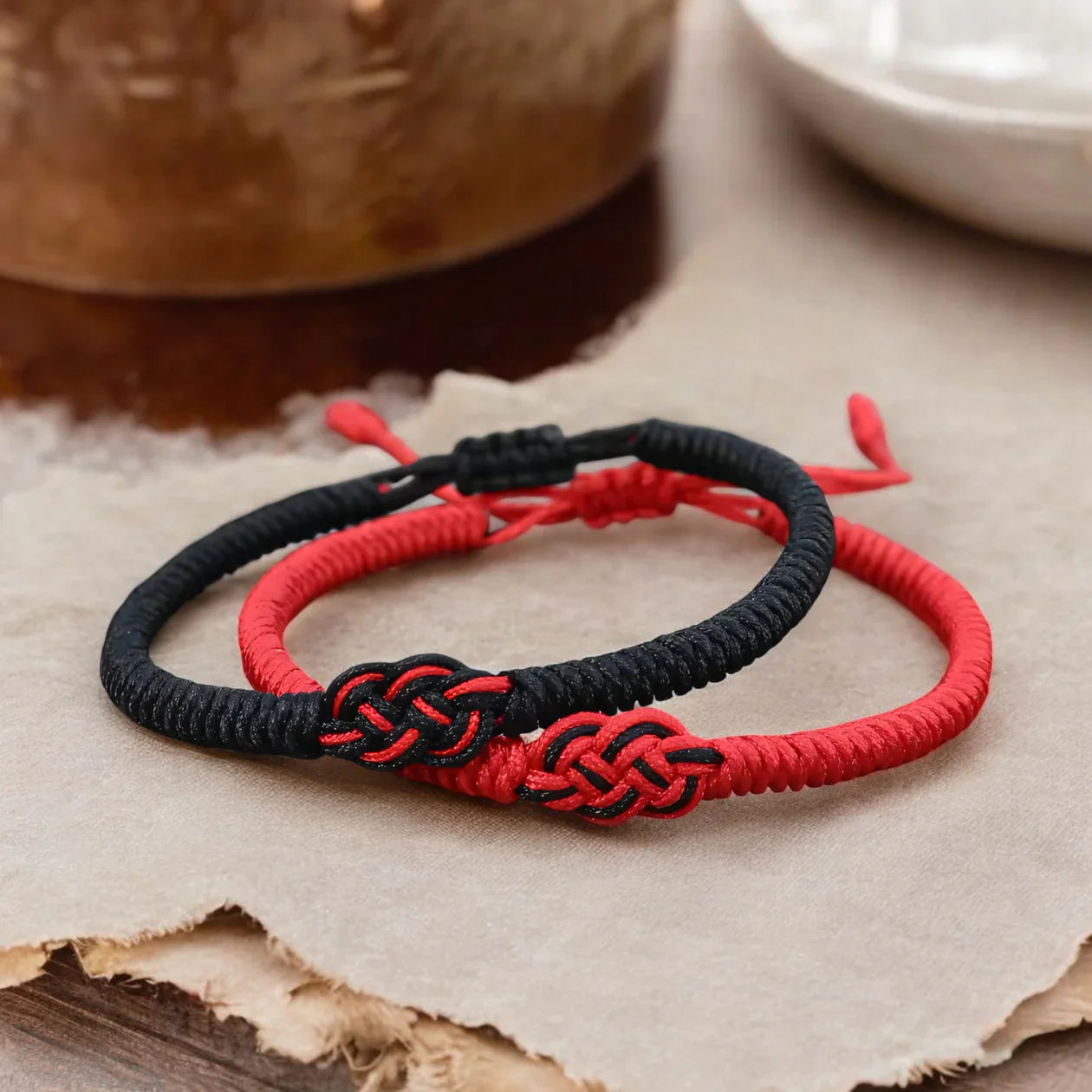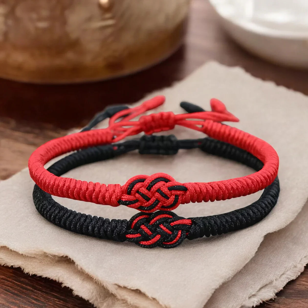 Our elegant knot design weaves red and black threads together, balancing softness for everyday wear with durability that lasts.