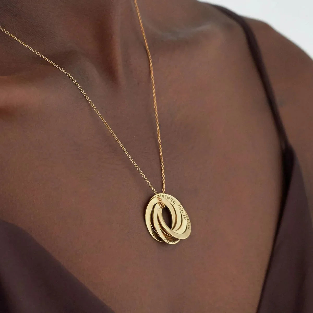 The Family Name Rings Necklace features beautifully interlocking circles that represent your eternal connections to those you cherish most.