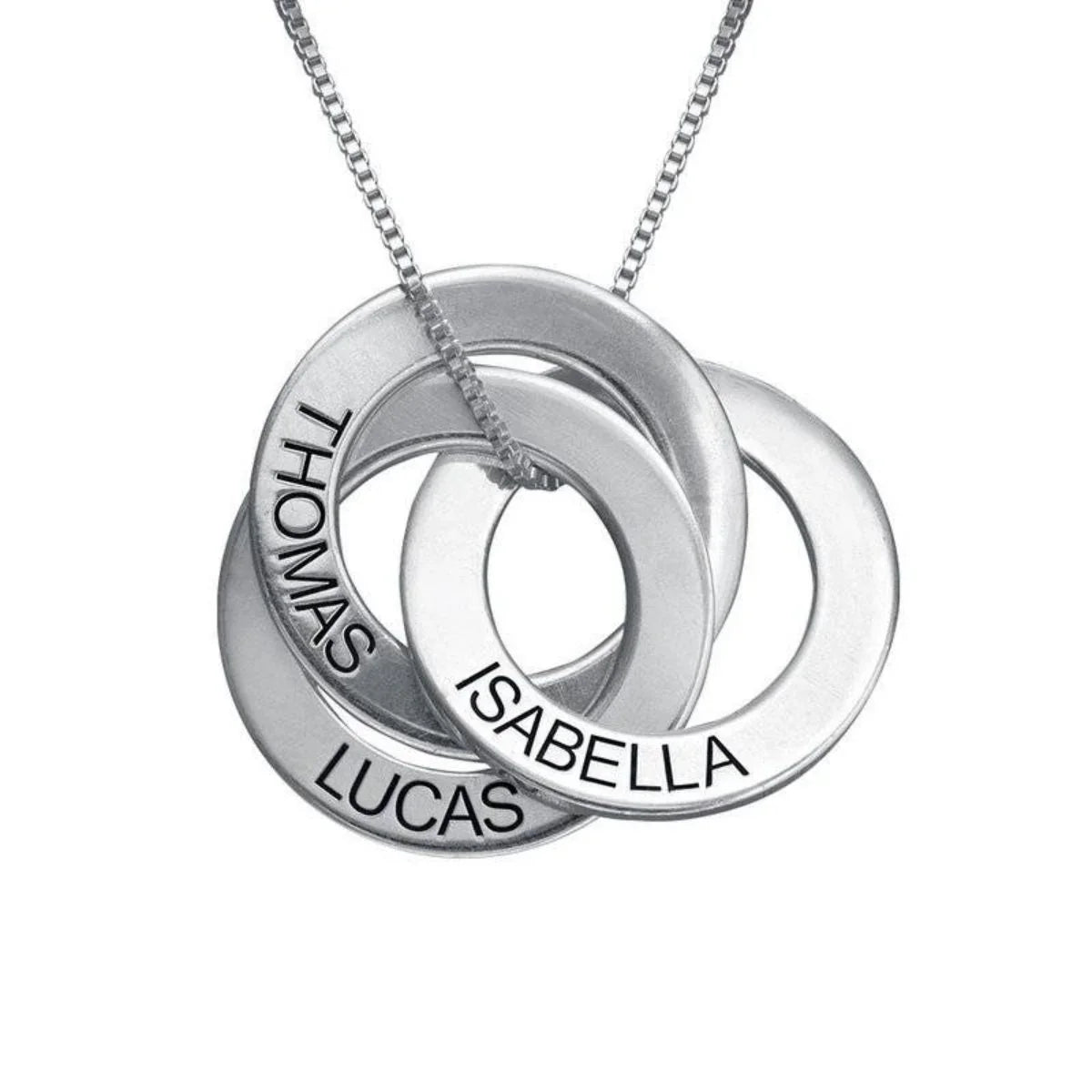 Each ring is carefully engraved with a name, creating a stylish yet deeply meaningful piece that celebrates your unique family bonds.