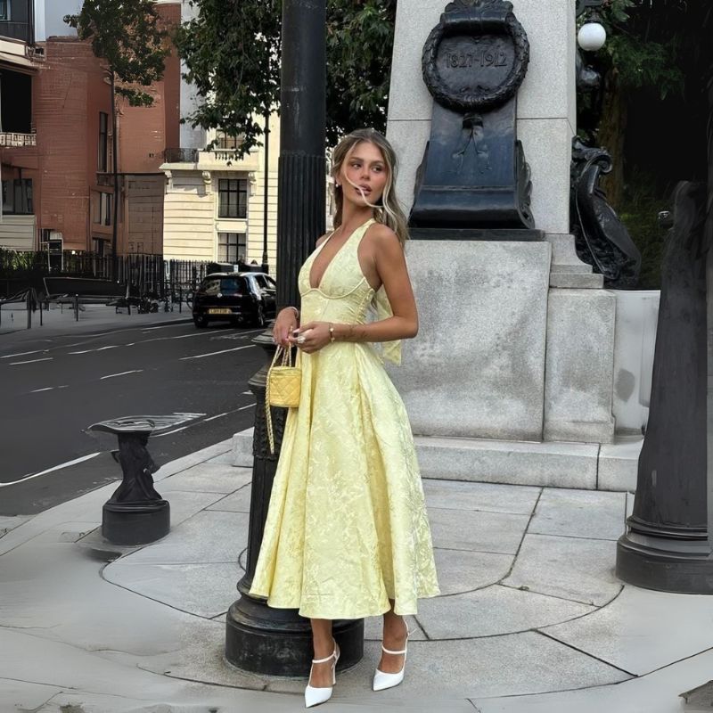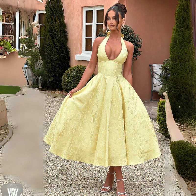 Ein ärmelloses Midikleid mit markantem Ausschnitt und ausgewogenen Proportionen. Geeignet für Hochzeiten, Feiern und besondere Tagesmomente dezent, präzise und wirkungsvoll.
